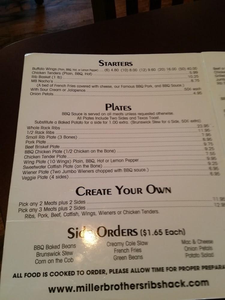 Miller Brothers' menu centers around traditional BBQ options, with a variety of plates available. They offer a standout 1/2 rack of ribs, beef brisket plate, and fried catfish fillets. Customizable options also feature prominently.